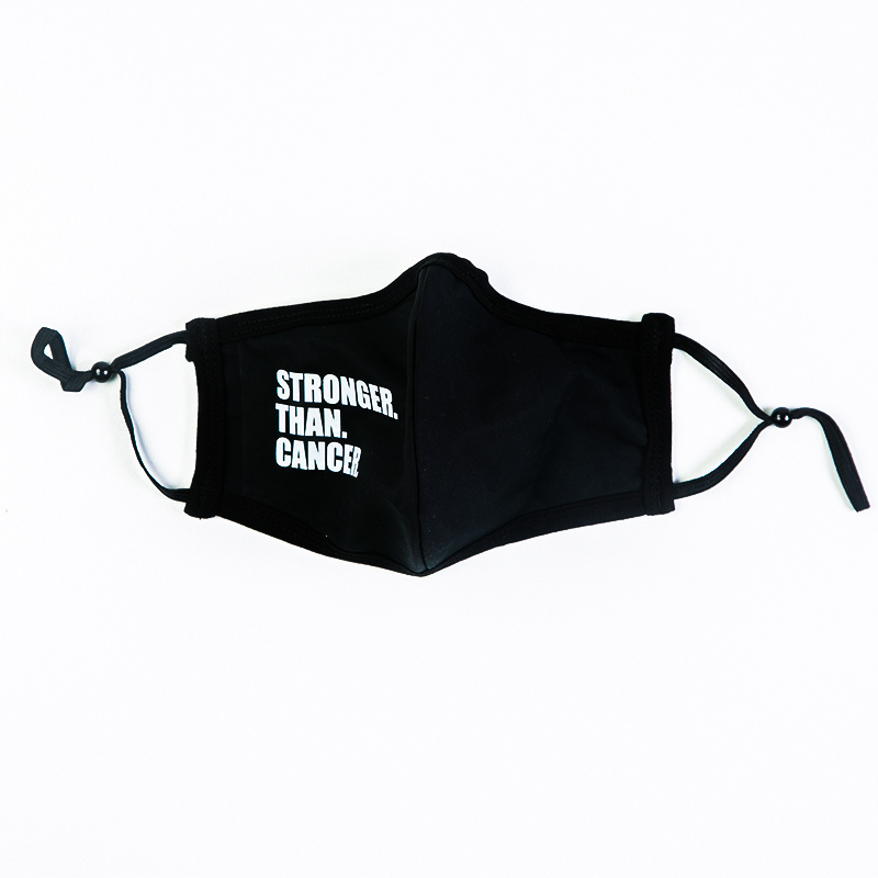 كمامة باللون الأسود مزينة بتصميم كلمات إيجابية"Stonger than cancer".