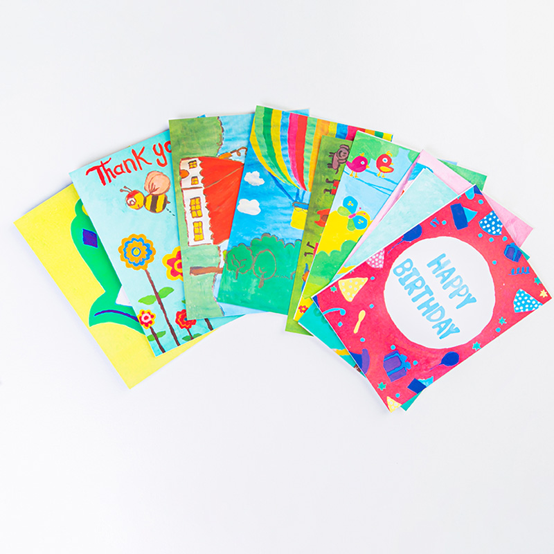 بطاقة معايدة بتصاميم من رسومات مرضى السرطان الأطفال في مركز الحسين للسرطان، وتحتوي على مغلف لون أبيض.