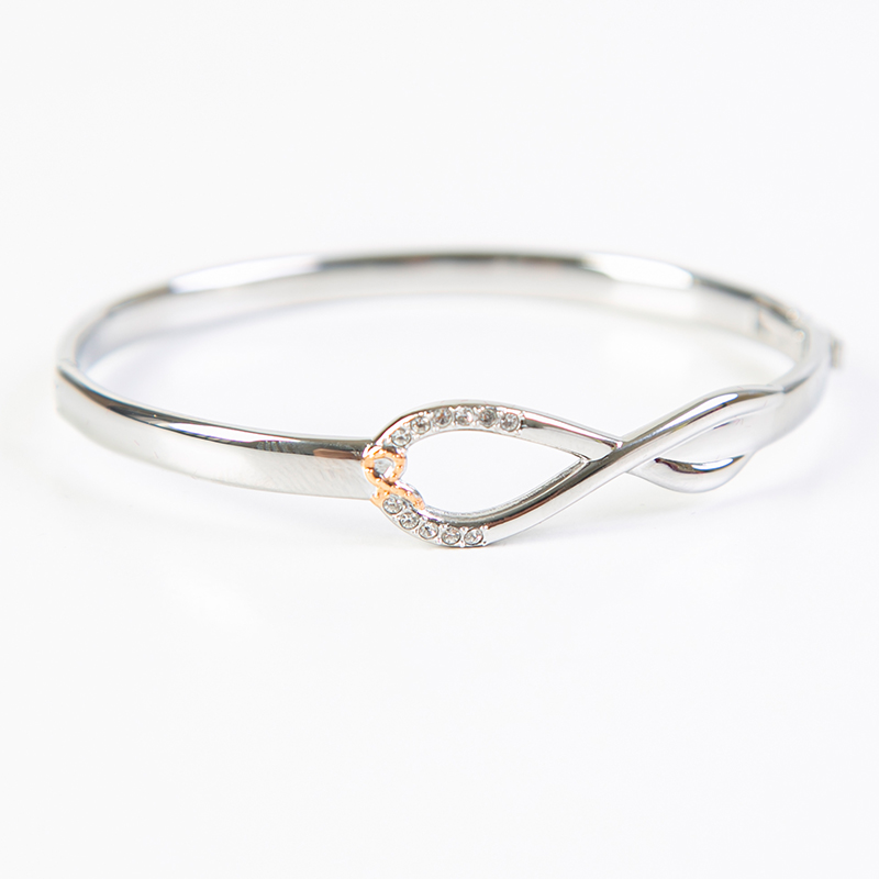 Bangle in silver color designed with Infinity ribbon.Size: 6 cm x 5cm.