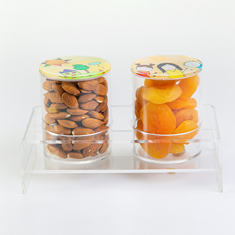 Two plexi containers with covers designed inspired from the drawings of pediatric cancer patients at KHCC (including holder).Round: 8cm Height: 10cm.